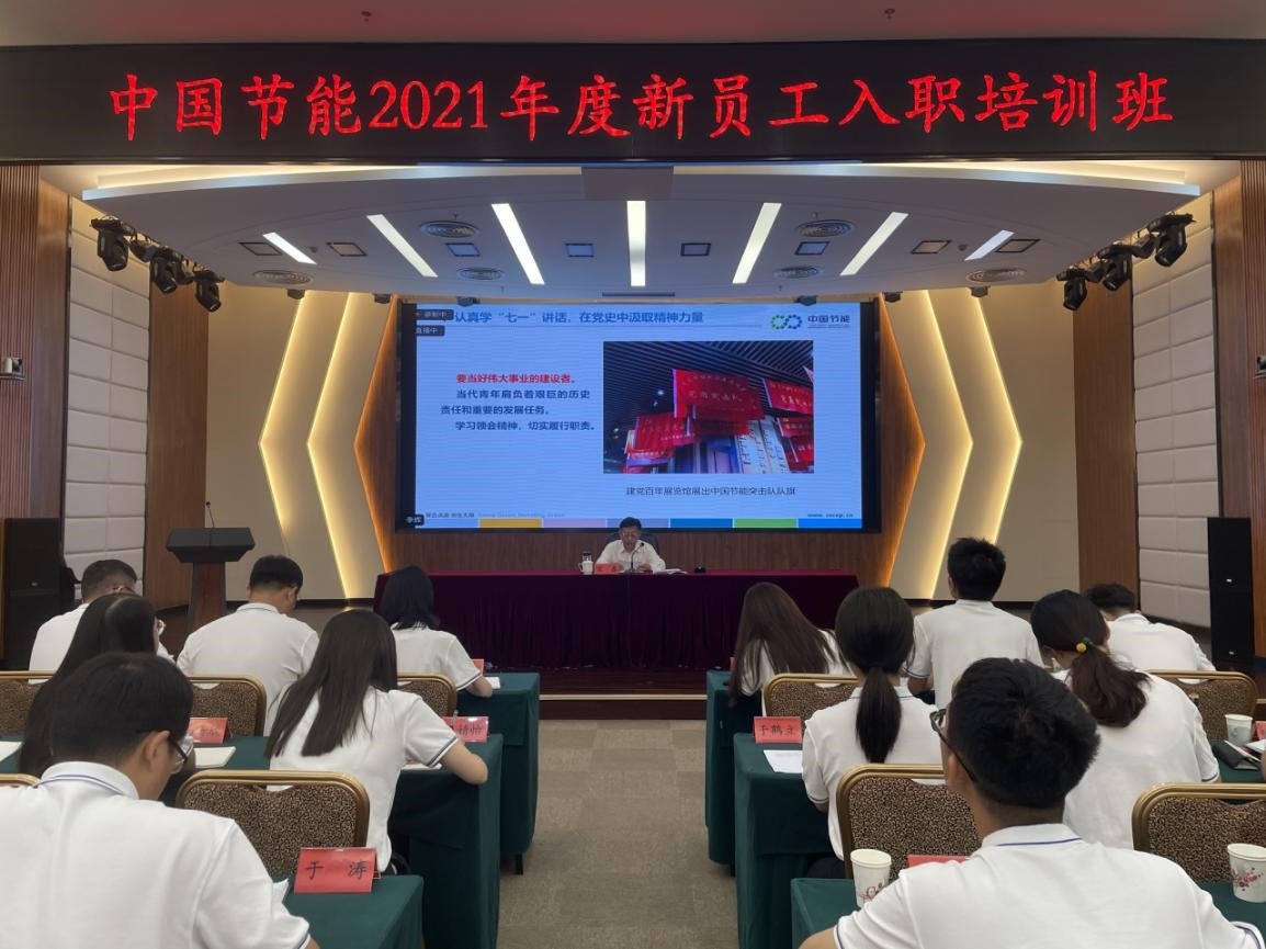 7月19日,集团公司2021年新员工入职培训班开班,党委书记、董事长宋鑫以“坚定理想信念,共建绿水青山,为推进生态文明建设美丽中国贡献节能力量”为题,为2021年度新员工讲授开班第一课。