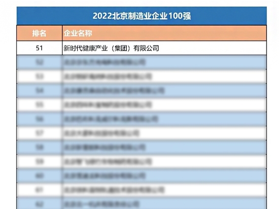 12月22日,“2022北京企业100新闻发布会”在北京国际会议中心成功举办。会上公布了2022年度北京企业100强、制造业企业100强等榜单。新时代集团所属健康产业公司成功上榜“北京制造业企业100强”榜单。