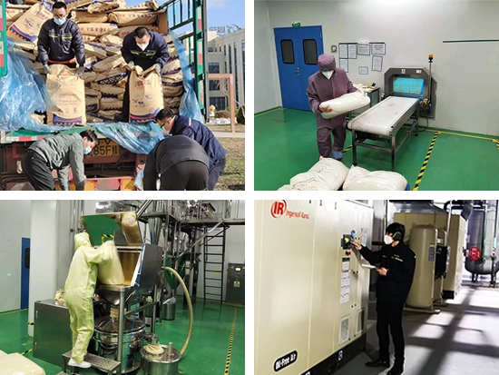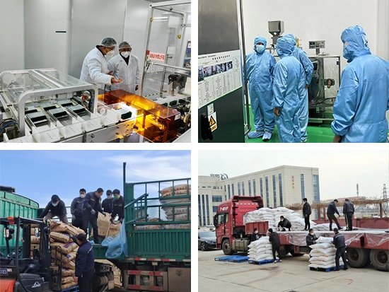 工人们元气满满忙中有序,产品生产热火朝天,供应链响应效率大幅提升。生产车间的员工们严格把关,检严守质量生命线;物流中心的员工们加班加点保运输。其他各部门员工也都齐上阵支援生产,力保免疫力产品的生产和供应。