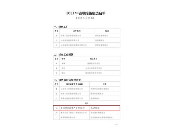 为达成工业领域碳达峰碳中和目标,实现公司可持续发展,烟台新时代健康产业有限公司(以下简称:烟台健康公司)近年来一直积极开展绿色供应链企业管理工作,经自我评价、第三方评价、市级工信部门评估推荐、专家论证、社会公示等程序,于2023年7月27日获评“省级绿色供应链管理企业”荣誉称号。