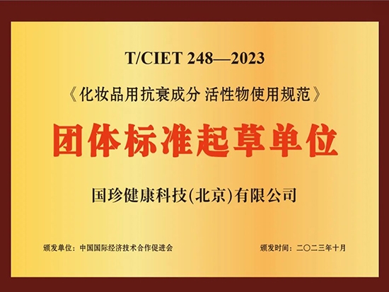 近日,健康产业公司国珍健康研究院携手中国国际经济技术合作促进会,牵头起草并发布了《化妆品用抗衰成分 活性物使用规范》团体标准(T/CIET 248-2023)。健康产业公司作为该团体标准主要起草单位,在团体标准制定过程中做出了突出贡献,获得了业内高度评价。