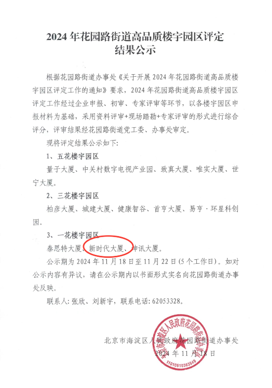 近日,新时代集团花园路新时代大厦在海淀区花园路街道2024年高品质楼宇园区评定中荣获“一花楼宇园区”称号,为花园路街道楼宇管理树立了新标杆。